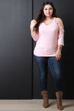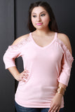 A plus size top featuring a soft jersey knit, v-neckline, and a cold shoulder design with three-quarters sleeves and floral crochet trim. Finished with ruched sides. Accessories sold separately. 48% Polyester, 48% Rayon, 4% Spandex.
