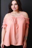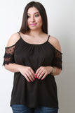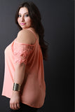 This plus size top features a round neckline, cold shoulder design, and elbow sleeves with floral crochet. Accessories sold separately. 48% Polyester, 48% Rayon, 4% Spandex.