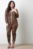 This fierce plus size jumpsuit features cheetah pattern print design, zipper front, hoodie back, long sleeves, kangaroo pockets, and jogger cut legs. Accessories sold separately. Made in U.S.A. 95% Cotton, 5% Spandex.