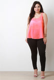 This plus size top features a sleeveless design round neckline, three spaghetti shoulder straps to a caged racer back with a floral crochet patch center, relax fit, semi-sheer chiffon fabrication, and a slight high low hemline. Accessories sold separately. 100% Polyester.