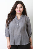 This plus size top features half placket neckline with double buttons, flat collar, quarter-length sleeves with button tab, and relax fit. Accessories sold separately. Made in U.S.A. 100% Cotton.