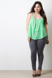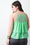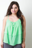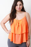 This plus size sleeveless top features a scoop neckline with 3-button d�cor, adjustable spaghetti shoulder straps, embroider mesh back panel, and a double tier design. Accessories sold separately. 100% Polyester.