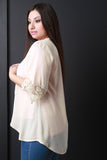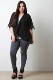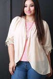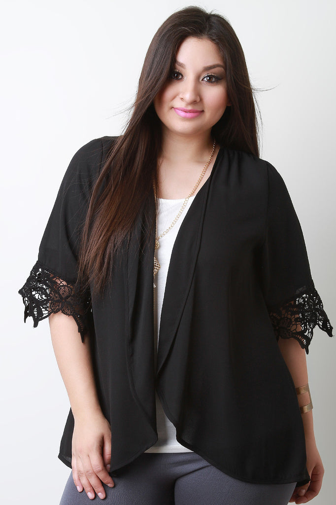 This lightweight plus size cardigan features semi-sheer fabrication, draped open front construction and short sleeves with crochet lace design. Accessories sold separately. 100% Polyester.