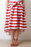 This pleated plus size skirt features two tone horizontal striped fabrication and a wide waistband with a self-tie bow detail. Finished with a hidden side zipper closure and a high low hemline. Accessories sold separately. 100% Polyester. Contrast: 95% Polyester, 5% Spandex.
