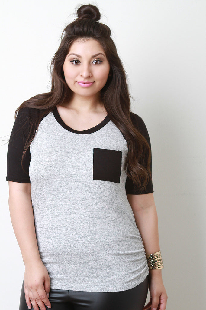 This plus size top features a round neckline, color block shoulder design, and short sleeves. Finished with jersey knit fabrication, gathered material on sides and a breast pocket . Accessories sold separately. 49% Rayon , 47% Polyester, 4% Spandex. Contrast: 97% Rayon, 3% Spandex.