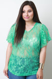 This top features a floral lace mesh pattern throughout, V neckline, short kimono sleeves, and finished with cinched side detailing. Accessories sold separately. Made in U.S.A. 92% Polyester, 8% Spandex.