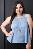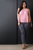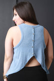 This plus size knit top features a round neckline, sleeveless design, and faux button-up back. Finished with a high-low hemline. Accessories sold separately. Made in U.S.A. 67.5% Rayon, 21.2% Polyester, 11.3% Spandex.