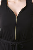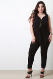 This  plus size jumpsuit  features an adjustable zipper v-neckline, sleeveless design, elasticized cinched waist with a removable sash, and taper cut leg with ruched accent. Accessories sold separately. Made in U.S.A. 97% Viscose, 3% Spandex.