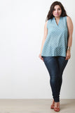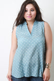 This airy plus size top features a textured weave fabrication, an all over polka dot print, sleeveless tank top design, mandarin collar v neckline, with a rounded high low hem. Accessories sold separately. 80% Polyester 20% Cotton.