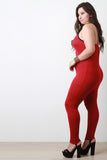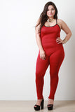 This fitted plus size jumpsuit features a soft marled knit fabrication, scoop neck with contrast spaghetti shoulder straps, sleeveless construction, and taper cut legs. Accessories sold separately. Made in U.S.A. 95% Polyester, 5% Spandex.
