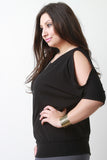 This plus size top features a soft knit fabrication, cold shoulder, and round neckline, bat wing half sleeve, gathering detail at hem. Necklace included, other accessories sold separately. 97% Polyester 3% Spandex.