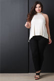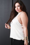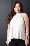 This plus size top features a soft knit fabrication, sleeveless construction, and keyhole opening design at back, tie closure, loose fit, with a high low hem line. Accessories sold separately. Made in U.S.A. 95% Rayon 5% Spandex.