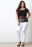 This plus size top features a mesh panel construction, jersey knit bustier cover, short sleeves, and finished with a boat neckline. Accessories sold separately. Made in U.S.A. Self: 90% Nylon, 10% Spandex. Contrast: 97% Rayon, 3% Spandex.