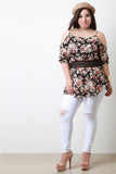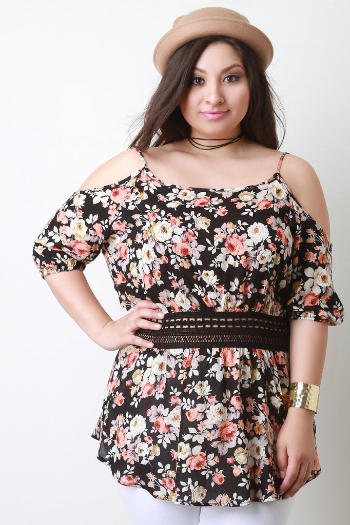 This plus size top features a soft knit fabrication, floral print throughout, cold shoulder with thin shoulder straps, and an elasticized crochet lace midriff. Finished with a rounded hemline. Accessories sold separately. Made in U.S.A. 100% Rayon.
