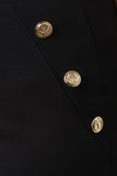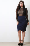 This skirt features a stretchy knit fabrication, elasticized waistband, gold anchor detailed buttons accent, and pencil cut fit. Finished with an asymmetrical hemline, and back slit. Accessories sold separately. Made in U.S.A. 66% Rayon, 30% Nylon, 4% Spandex.