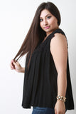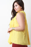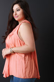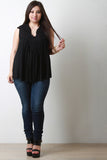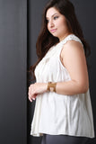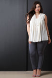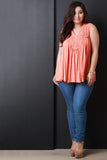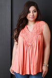 This charming plus size top features a round neckline with a V-placket, sleeveless construction, crochet lace panel at yoke, gathered detail, and flowy hemline. Accessories sold separately. 65% Cotton, 35% Polyester.
