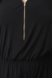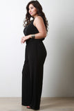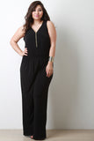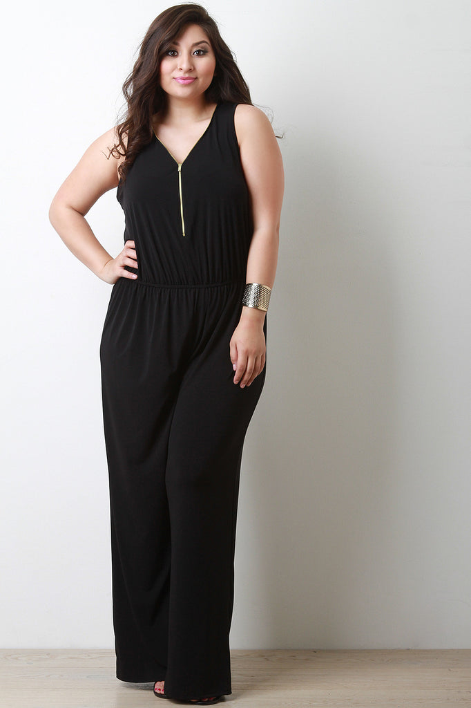 This plus size jumpsuit features a contrasting zip up front, sleeveless design, cinched waistline, wide legs, and relaxed fit below waist. Accessories sold separately. Made in U.S.A. 95% Polyester, 5% Spandex.