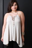 This casual plus size top features a thermal knit fabrication, lace up neckline, spaghetti straps, racerback design, finished with an uneven shark bite hem line. Accessories sold separately. 97% Rayon, 3% Spandex