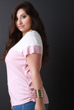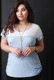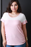 This top features a textured knit fabrication, scoop neckline, shortsleeve fit, and gold buttons accent on shoulders. Finished with a cinched side detail. Accessories sold separately. Made in U.S.A. 97% Rayon, 3% Spandex.