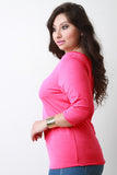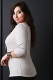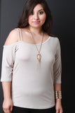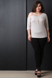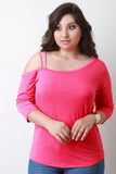 This plus size top has quarter sleeves with an off-the shoulder design on the right, featuring two shoulder straps. Flowy casual silhouette. Accessories sold separately. 95% Polyester. 5% Spandex.