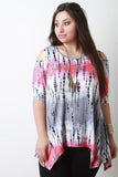 This cute plus size top features a jersey knit fabrication, scoop neckline, cold shoulder design, and elbow length sleeves. Finished with a sharkbite hemline. Accessories sold separately. Made in U.S.A. 97% Rayon, 3% Spandex.
