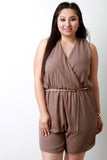 This romper features a chiffon upper with light lining, deep v surplice neckline, and self-tie lace at nape. Finished with cinched shoulders and waist, and includes a chain belt. Other accessories sold separately. Made in U.S.A. 100% Polyester.
