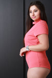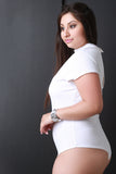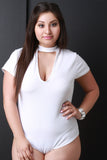 This plus size bodysuit features a mock neckline, front and back deep v cut outs, short sleeves, knit fabrication, button closure at nape, and double snap closure at crotch. Accessories sold separately. Made in U.S.A. 95% Polyester, 5% Spandex.