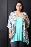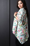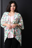 This kimono features a flowy knit fabrication with floral print design, open front fit, short sleeves, and handkerchief hemline finish. Accessories sold separately. Made in U.S.A. 100% Polyester.