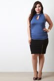 This plus size top features a jersey knit fabrication, mock neckline with double button hook closure, front and back keyhole detail, and sleeveless fit. Finished with a cinched side design. Accessories sold separately. Made in U.S.A. 97% Rayon. 3% Spandex.