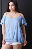 This plus size top features woven fabrication, a cold shoulder design, scoop neckline, ruffle sleeves, a flare cut hem, and crochet trim high low hemline. Accessories sold separately. Made in U.S.A. 100% Rayon