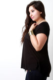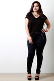 This plus size tee features a soft knit fabrication, v neckline, relaxed fit, short sleeves, and a eyelet trim at the neckline. Accessories sold separately. Made in U.S.A. 95% Rayon, 5% Spandex.