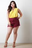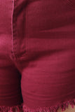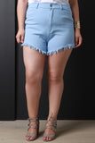 These plus size shorts features a frayed hemline, belt loops, faux front pockets, two back patch pockets, zipper fly, and a single button closure. Accessories sold separately. 97% Cotton, 3% Spandex.