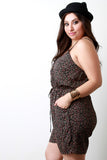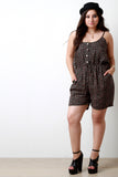 This plus size romper features a woven knit fabrication, floral print throughout, spaghetti straps, and button-up front detail. Finished with a cinched elasticized waist and self-tie drawstring design. Accessories sold separately. Made in U.S.A. 100% Rayon.