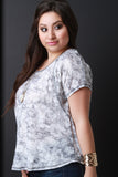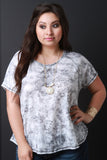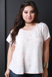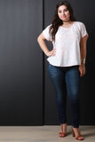 This plus size top features a knit fabrication , boxy loose fit, rounded neckline, stylized seams, and short dolman sleeves. Accessories sold separately. Made in U.S.A. 95% Polyester, 5% Spandex.