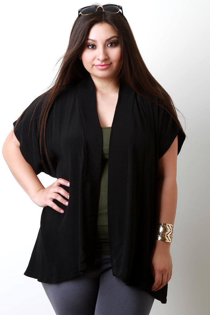 This plus size cardigan features a lightweight flowy knit fabrication, wide collar detail, short dolman sleeves, and open front design. Accessories sold separately. Made in U.S.A. 100% Polyester.