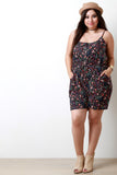 This plus size romper features a lightweight knit fabrication, floral print pattern, spaghetti straps, and button up front. Finished with a cinched elasticized waist with self-tie drawstring and two front pockets. Accessories sold separately. Made in U.S.A. 100% Polyester.