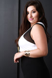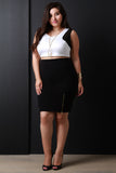 This contemporary plus size top features a rounded neckline, sleeveless design, contrast mesh cut out armholes, with a cropped hemline. Accessories sold separately. Made in U.S.A. 95% Polyester 5% Spandex.