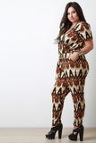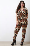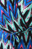 This plus size jumpsuit features smooth stretch fabric, colorful chevron print, surplice neckline, short sleeves, and self-tie belt at waist. Accessories sold separately. Made in USA. 95% Polyester, 5% Spandex.