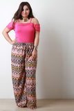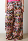 These plus size  pants  feature geo pattern print, elasticized waist, self-tie drawstring, and wide legs. Accessories sold separately. 100% Polyester.
