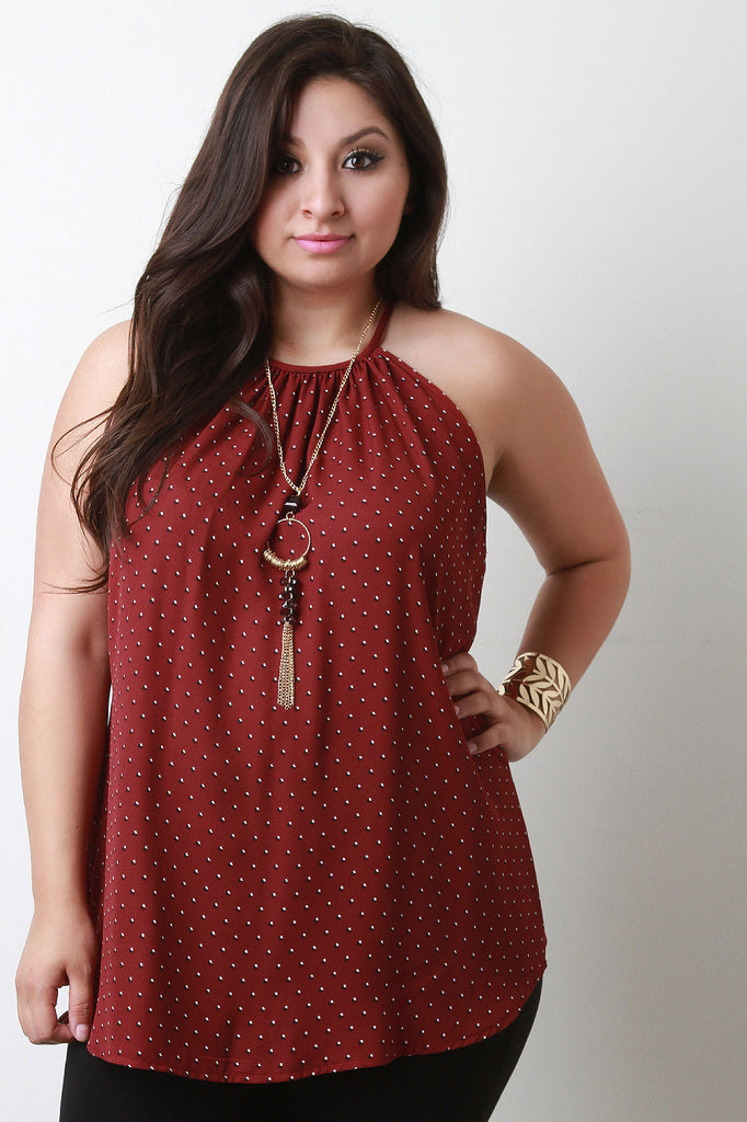 This high neck plus size top features a flowy graphic patterned print chiffon, sleeveless design, keyhole back with button closure at nape, and curved hemline. Top comes with faux gemstone hoop pendant necklace. Other accessories sold separately. 100% Polyester.