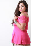 This plus size top features a square neckline, cold shoulder design, floral lace trims, and short sleeves. Accessories sold separately. 48% Polyester, 97% Rayon, 3% Spandex.