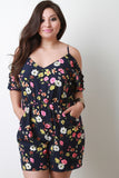 This plus size floral print fabrication, v neckline, spaghetti straps, and cold shoulder cutouts with ruffle trims. Finished with a cinch waistline, two front pockets, and deep scoop back with self-tie strap detail. Accessories sold separately. 100% Polyester.