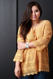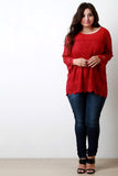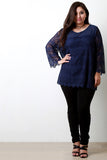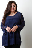 This plus size top features a woven semi-sheer fabrication with contrasting crochet lace, boat neckline, and long sleeves fit. Finished with a scallop trim and hemline, and rear zip-up closure. Accessories sold separately. 50% Cotton, 50% Polyester.