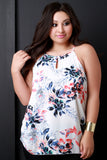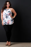 This plus size top features a chiffon fabrication, floral print pattern, halter neckline, keyhole detail, and sleeveless fit. Finished with a button hook closure at nape and gathered sides. Accessories sold separately. Made in U.S.A. 100% Polyester.