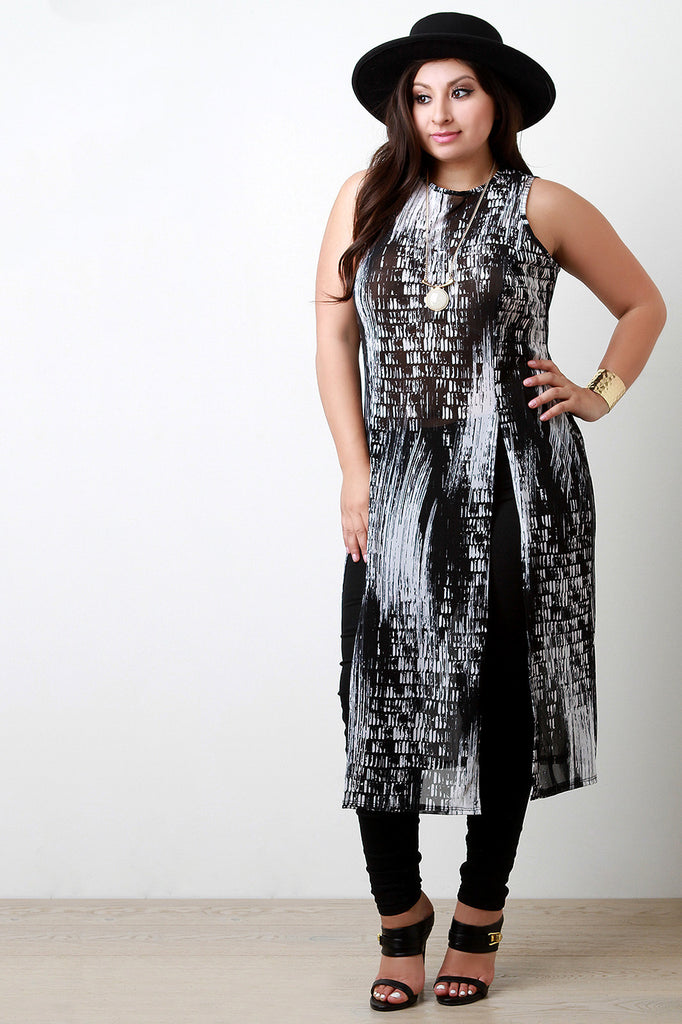 This chic plus size top features a printed semi-sheer mesh fabrication, round neckline, and sleeveless construction. Finished with two front high slits and button hook closure at nape. Accessories sold separately. Made in U.S.A. 95% Polyester, 5% Spandex.