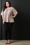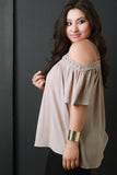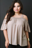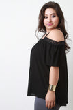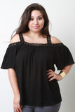 This features a crinkled fabric, square neckline, cold shoulder construction with lace trims, flowy fit, and curved hem. Accessories sold separately. 100% Rayon.