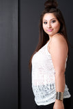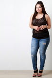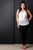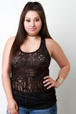 This stylish plus size top features geometrical shapes burned-out on a semi-sheer mesh fabric, scoop neckline, and sleevless fit. Finished with a rounded hemline with elasticized cinched sides. Accessories sold separately. Made in U.S.A. 60% Polyester, 40% Spandex.