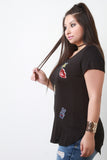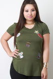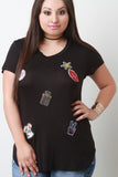 This  plus size tee  features an assorted sequin patches design at front, crew neckline, short sleeves, and curved hem. Accessories sold separately. Made in U.S.A. 97% Rayon, 3% Spandex.