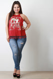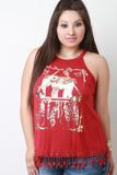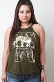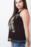 This cute plus size tank top features a rounded neckline, spaghetti straps, a relaxed fit, soft knit fabrication, metallic graphic print with an boho elephant that says" Dream Big", and a flare cut hem with crochet tassel trim. Accessories sold separately. 97% Rayon 3%Spandex.