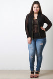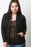 This plus size jacket features a semi-sheer mesh knit fabrication, zipper front, long sleeves design, two front pockets, and contrasting banded hemline. Accessories sold separately. Made in U.S.A. 90% Nylon, 10% Spandex.